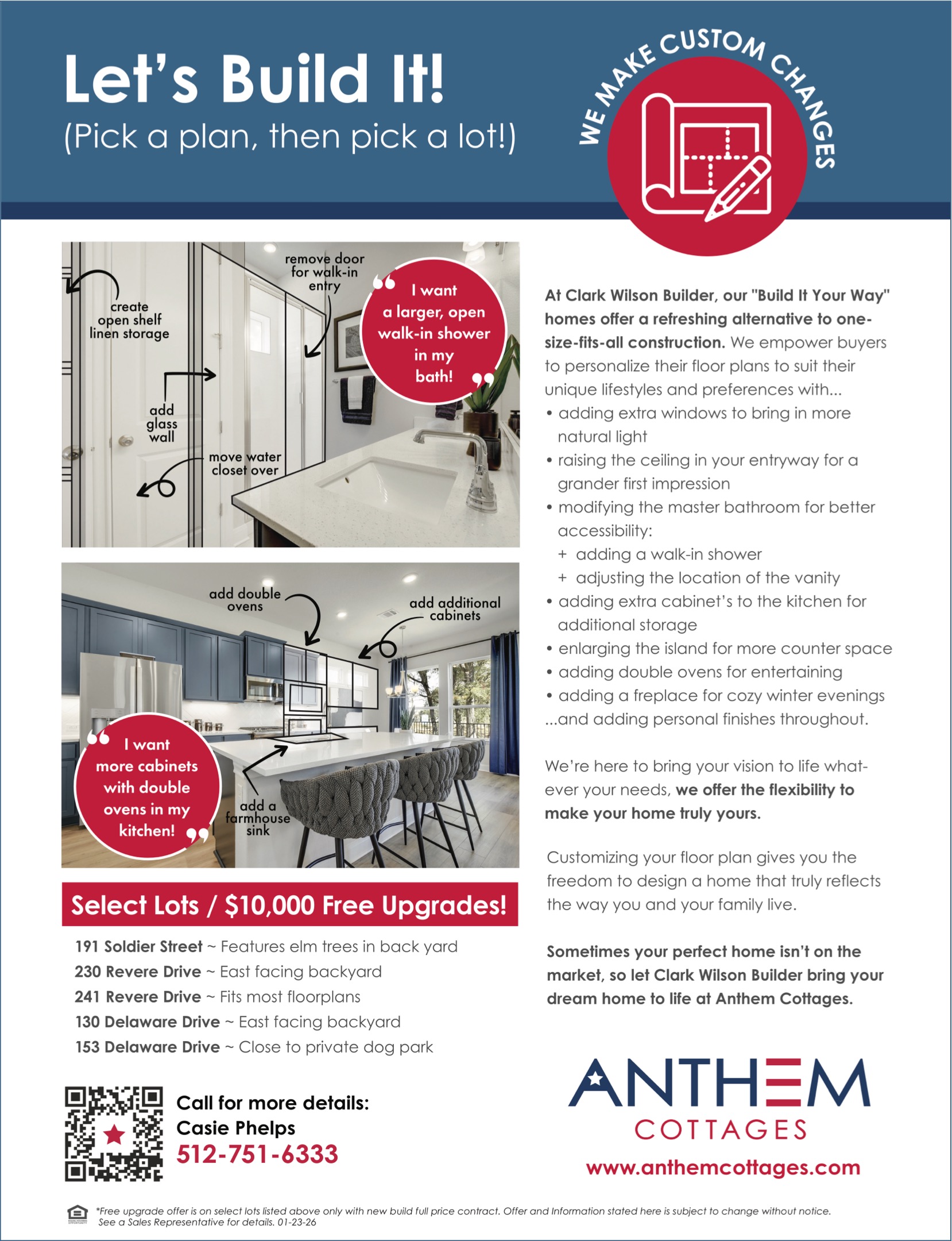 Pick a plan, then pick a featured lot and Build It Your Way at Anthem Cottages, a gated community in Kyle Texas!