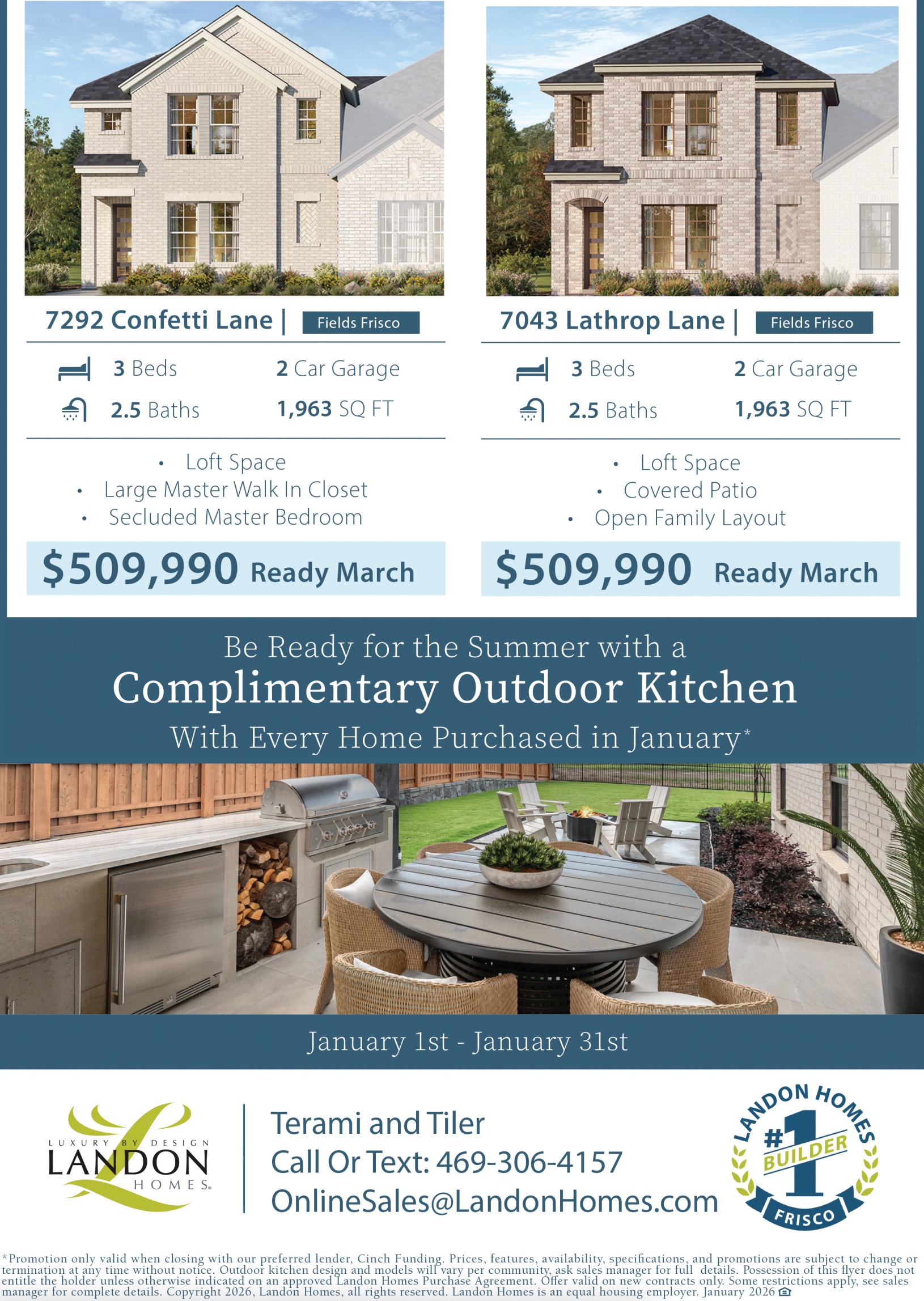 It’s a new year and the perfect time for a new home. Purchase in January and receive a complimentary outdoor kitchen with your new home.