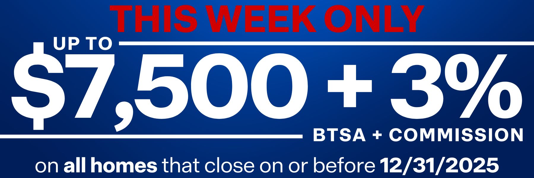 Up to 3% commission and up to $7,500 BTSA valid on select D.R. Horton homes in Northwest Houston that contract between 10/13/25 - 10/19/25, and close by 12/31/25. BTSA and Commission paid at closing. Commission calculated on the final purchase price stated on the Closing Disclosure. Offer valid on new, full price contracts and does not apply to transfers, cancellations, or rewrites. Buyer cannot have previously registered with D.R. Horton. BTSA and Commission are in lieu of any other commission, bonus, incentive, or promotion. Incentive available only for licensed Texas real estate agents. Agent must present BTSA coupon at initial contract to obtain the incentive. One coupon per Agent. Eligibility cannot be transferred. If buyer fails to timely close for any reason other than Seller default, broker will only receive the 3% co-broker commission subject to all conditions and stipulations in the contract. Any amount paid by D.R. Horton cannot exceed the amount agreed to in the broker’s compensation agreement with buyer and may be subject to caps imposed by buyer’s lender. Additional restrictions may apply. Contact a sales representative for complete details. D.R. Horton may cancel or change all offers without prior notice. Buyer’s agent must accompany and register buyer on first visit to the community. Equal Housing Opportunity. BTSA= Bonus To Sales Agent. Offer expires 10/19/25.