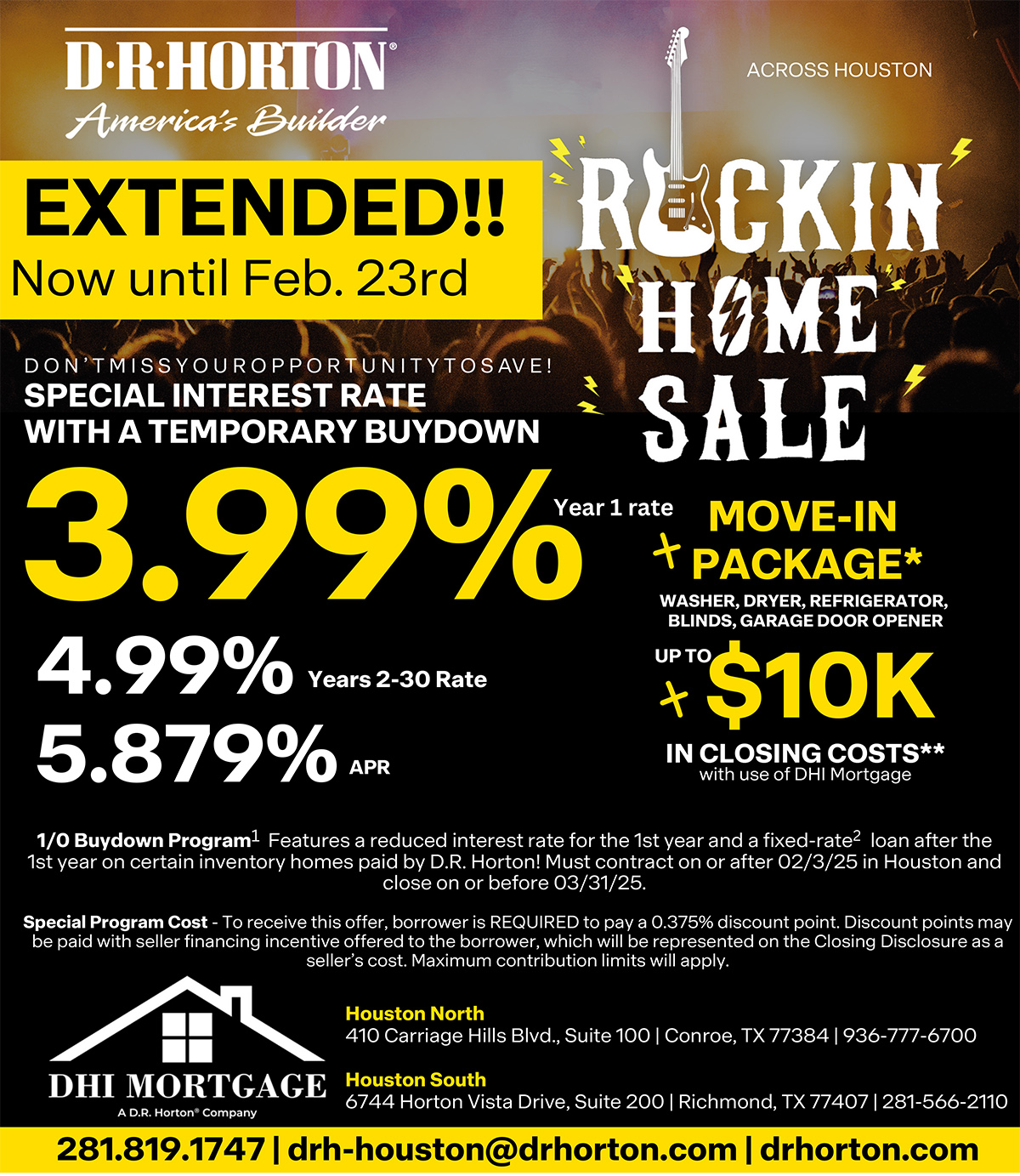 Special Interest Rate with a Temporary Buydown, Reduced Pricing, Closing Cost and Move-in Package incentives apply to select D.R. Horton homes located across the Houston Metro Area for new home contracts executed between 2/3/25 - 2/23/25, and close on or before 3/31/25. Sale prices available on a first come, first served basis beginning on 2/3/25 and continuing through 2/23/25. If buyer fails to close escrow on or before 3/31/25 for any reason other than seller's default, buyer shall pay the price of the home as advertised immediately prior to this price reduction. Please contact a community sales representative for complete details and pricing, including a list of available homes. Pricing does not include closing costs and fees, lot premiums, modifications to plans, and custom features, which may all substantially affect final cost of the home. Prices vary by community. At closing, buyer will receive the following Move-In Package*: Whirlpool® Side by-Side Stainless Steel Refrigerator (WRS315SDM), retail value $1,300, Whirlpool® Top Load Washer (WTW4855HW) & Whirlpool® Front Load Dryer (WED4850HW), retail value $1,080, A Better Blind 2” White Faux Blinds, retail value $548 (excludes round windows), and LiftMaster® Standard Garage Door Opener, retail value $700, with the use of any lender. D.R. Horton reserves the right to substitute for equal or higher priced models. Appliance make and model may vary due to supply availability. Incentive valid only for new contracts and does not apply to transfers, cancellations, or rewrites. Incentives subject to change at any time without notice or obligation. Incentives are in lieu of any current promotion, bonus, or incentive. Must present this flyer at contract execution. Must close to receive incentives. Other restrictions apply; see community sales agent for complete details and a list of homes. No cash value. This promotion may not be available to buyers purchasing homes as investment property; please contact the community sales representative for details. Home and community information, pricing, plans, elevations, included features, options, terms, availability, amenities, and co-broke are subject to change and prior sale at any time without notice or obligation. Drawings, pictures, photographs, video, square footages, colors, features, and sizes are for illustration purposes only and will vary from the homes as built. D.R. Horton reserves the right to cancel or change all offers without prior notice or obligation. D.R. Horton America’s Builder is a registered trademark of D.R. Horton, Inc. Other registered trademarks used above are used for informational purposes only and do not indicate endorsement or sponsorship of the products or services of D.R. Horton, Inc. Financing for South Division communities is offered by DHI Mortgage Company, Ltd. (DHIM) Branch NMLS #196971, Company NMLS #14622. 6744 Horton Vista Drive, Suite 200, Richmond, TX 77407. Financing for the North Division communities is offered by DHI Mortgage Company, Ltd. (DHIM). Branch NMLS #260545. 410 Carriage Hills Blvd., Suite 100, Conroe, TX 77384. DHIM is an affiliate of D.R. Horton, Inc. For more information about DHIM Licensing and its affiliation with D.R. Horton please visit http://www.dhimortgage.com/affiliate/. Closing Costs incentive valid on completed D.R. Horton Homes across the Houston Metro Area. Buyer must contract between 2/3/25 - 2/23/25, and close on or before 3/31/25 to receive closing costs incentive. Provided for informational purposes only. This is not a commitment to lend. Not all borrowers will qualify. If buyer funds and closes a qualifying home with DHIM, seller shall pay a maximum of up to $10,000 towards buyer's closing costs**. Any unused portion of closing costs incentive will be forfeited. Buyer is not required to finance through DHIM to purchase a home; however, buyer must use DHIM to be eligible for closing costs incentive. Some restrictions apply. The incentive may affect a homebuyer's loan. Please see your DHIM Loan Originator for details. Offer in lieu of any current promotion, bonus or incentive. No cash value; only one offer per home. Incentive only available on full price offers. This promotion is not available to buyers purchasing homes as investment property and does not apply to cash sales. Please contact the community sales representative for complete details. Closing cost incentives tied to the use of DHIM will vary by community, see sales agent for additional details. Prices vary by community. If buyer is working with a licensed real estate agent or broker, the agent or broker must accompany and register buyer on first visit to community. Terms and conditions apply. D.R. Horton reserves the right to cancel or change all offers without prior notice or obligation. 13.5% down payment required. Based on an FHA 30-year fixed-rate mortgage with a sales price of $333,500, a loan amount of $327,459, based on an upfront mortgage insurance premium of 1.75%, and a monthly payment of $2,435. APR based on Note Rate above for Years 2-30. Total monthly payment includes principal, interest, estimated taxes, mortgage Insurance, homeowners insurance, and HOA. Rate also available for VA, FHA, USDA loan programs. Property eligibility requirements apply. Funds for the temporary interest rate buydown used in this loan example will be offered as seller incentives up to $7,500 as disclosed in the sales contract. Buyer will have the option of using said incentive to pay closing costs OR to fund the temporary buydown cost of $2,333.01. SBC #9791. Seller incentives will be offered for buyer to use towards paying closing costs and/or the cost of the temporary buydown. The seller incentive amount and temporary buydown cost will vary based on the specific property and community, and will be disclosed in the sales contract/addendum. Please contact your Mortgage Loan Originator for additional information. Maximum contribution limits will apply. 2D.R. Horton has 