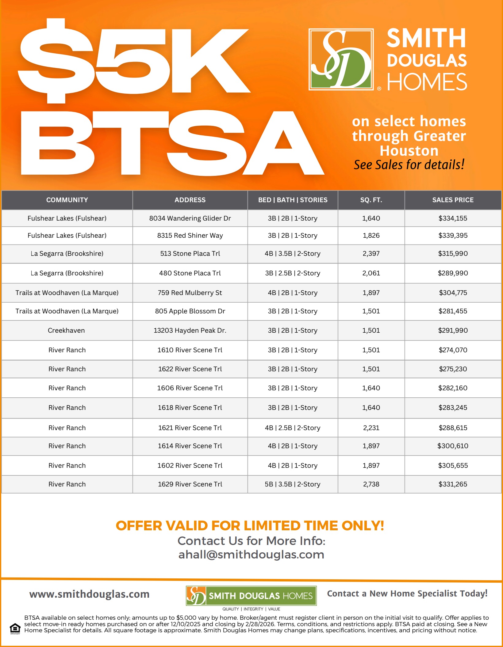 For Limited Time- $5K BTSA's on select homes throughout Greater Houston!