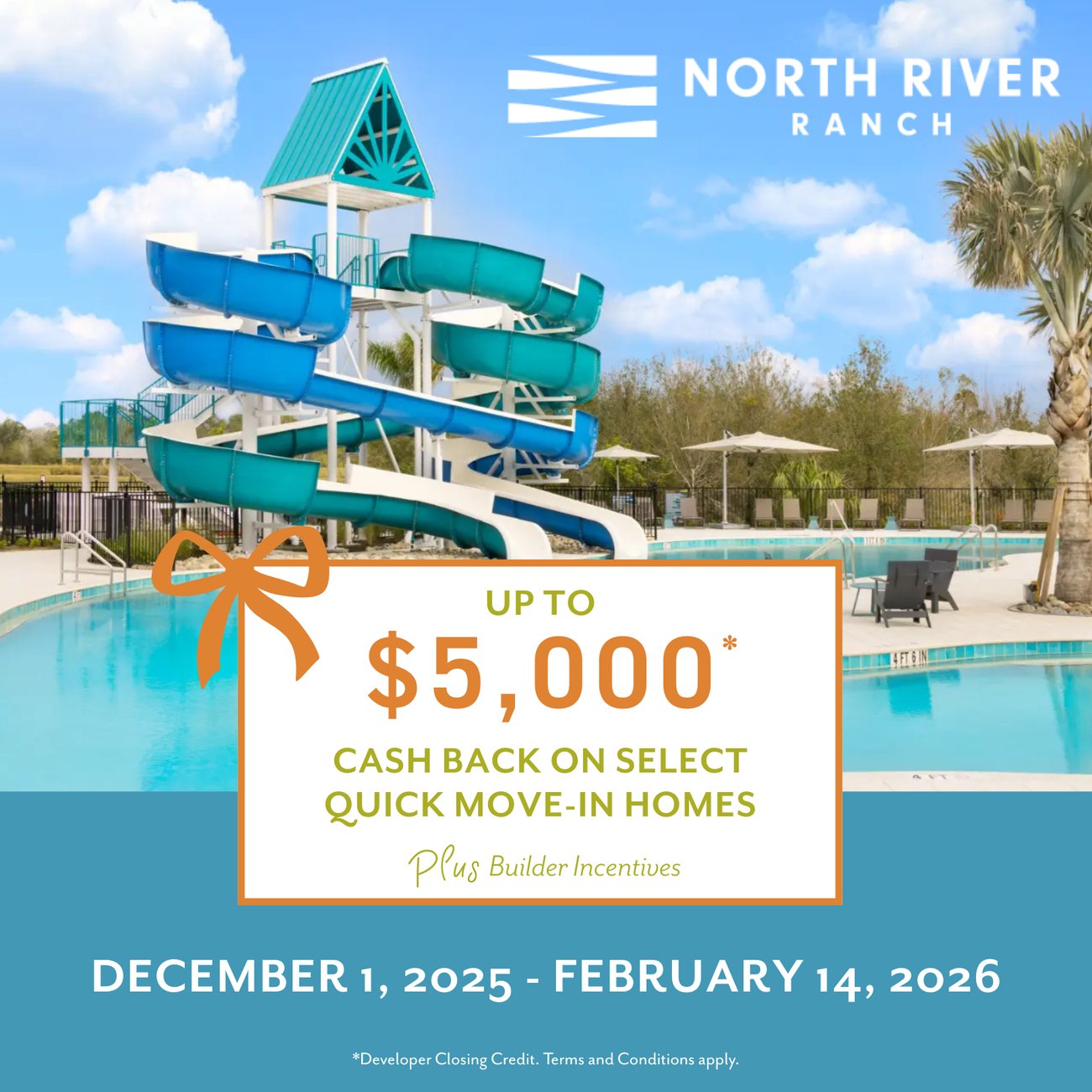 Copyright 2025 Neal Land & Neighborhoods (NLN). All rights reserved. Photography, renderings, site maps, plans, dimensions and community specifications shown are based upon current development concepts and artist’s interpretations and therefore are for illustrative purposes only. All prices are subject to change without notice. Prices, where shown, are provided by others and may be additionally subject to lot premium, option costs, and fees. Neal Land & Neighborhoods (NLN), North River Ranch (NRR), the North River Ranch Marketing Group (NRRMG), our affiliates, and subordinates cannot be held responsible for the accuracy of anything depicted in the Ad including but not limited to new home builder offerings, prices, plans, images, and specifications. The contents or information of any ad should be verified with the correct representatives, understood, and in writing before relying on the contents for said ad in making any decision to purchase or lease at North River Ranch. Nothing in the Ad represents a form of contract, exhibit or any commitment on behalf of NLN, NRR, NRRMG its affiliates and/or subordinates. We do business in accordance with the Federal Fair Housing Law. Broker participation welcome.